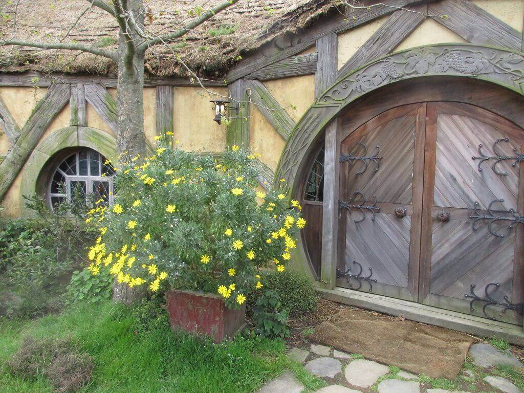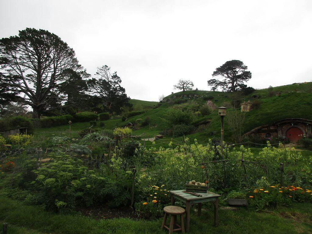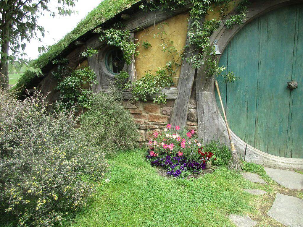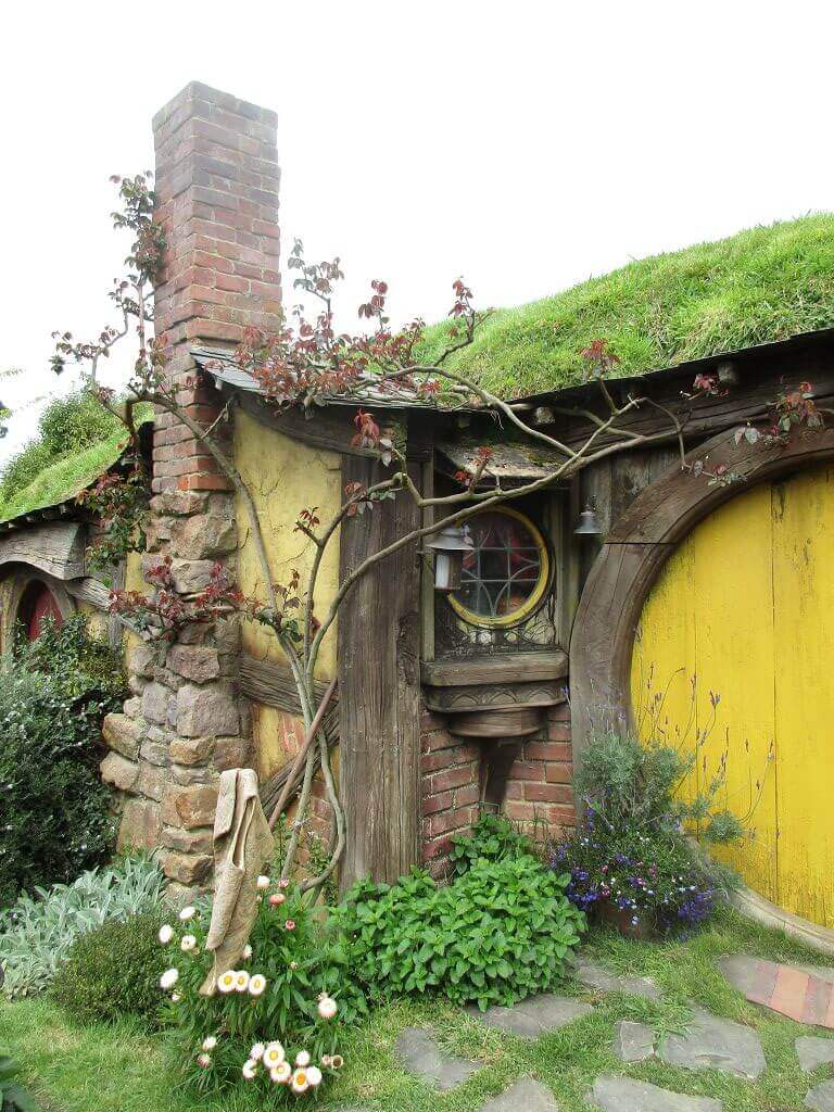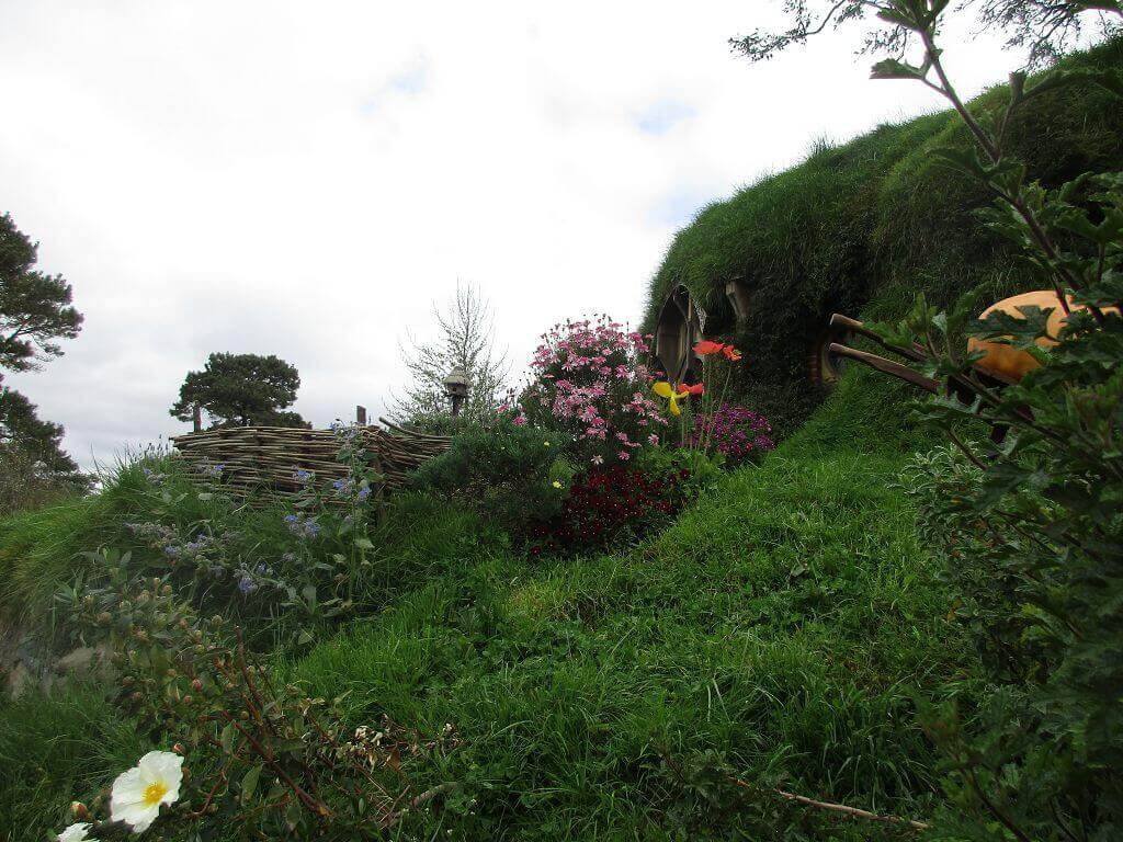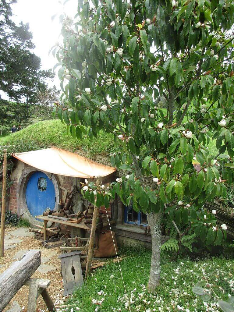 Am Eingang – dort wo auch der Film im Auenland beginnt – führt der Weg am Gemüsegarten vorbei. Und hier wächst es. Die Kartoffen sind hier gewachsen – sagt unser Guide. Und auch, dass am Ende dieses Tals der Hobbit wohnt, der dem Alkohol meist zuviel zuspricht. Gemütliche, propere Hummeln besorgen die Bestäubung der Blüten. Und in den Bäumen hängen Kalebassen mit Vogelfutter. Es gibt nicht nur öffentliches Grün, jedes deer Häuschen, die in den Berg hinein reichen – sind mit einen hüsch gepflegten Garten versehen. Jeder etwas anders – so wie die Profession ihrer Bewohner, jeder geht einem anderen Handwerk nach. Bäcker, Imker, Müller, Töpfer, Fischer – und Gärtner. Und ganz oben, mit der besten Aussicht, dort wohnt Bilbo Beutlin (hier natürlich Baggins) und Frodo. Draußen hängt die Wäsche. Und auf dem Dach steht ein Baum. Der im übrigen unecht ist. Das fällt mir schon von weitem auf. Ein bisschen Eiche ist echt, aber die Blätter sind alle handbemalt.