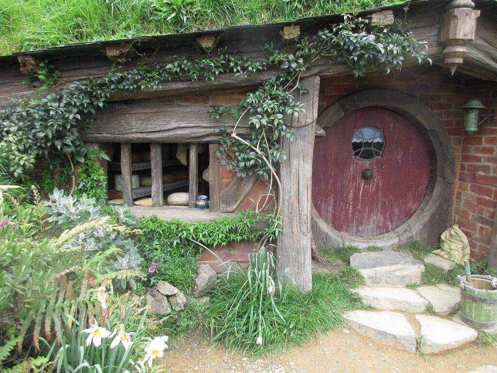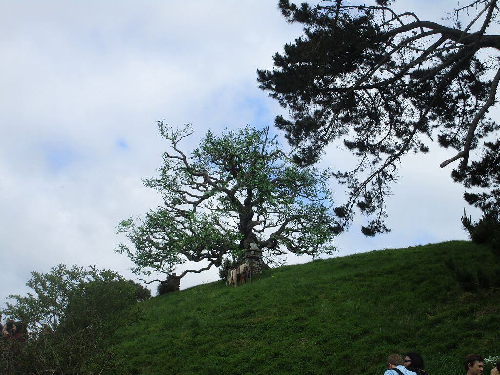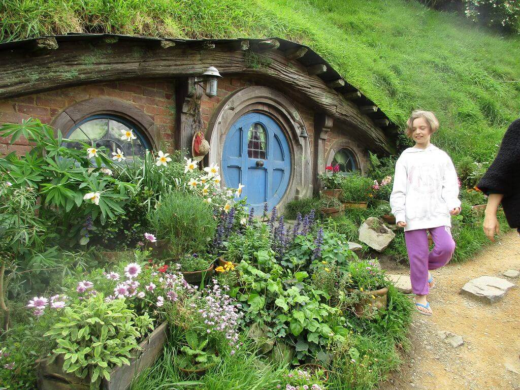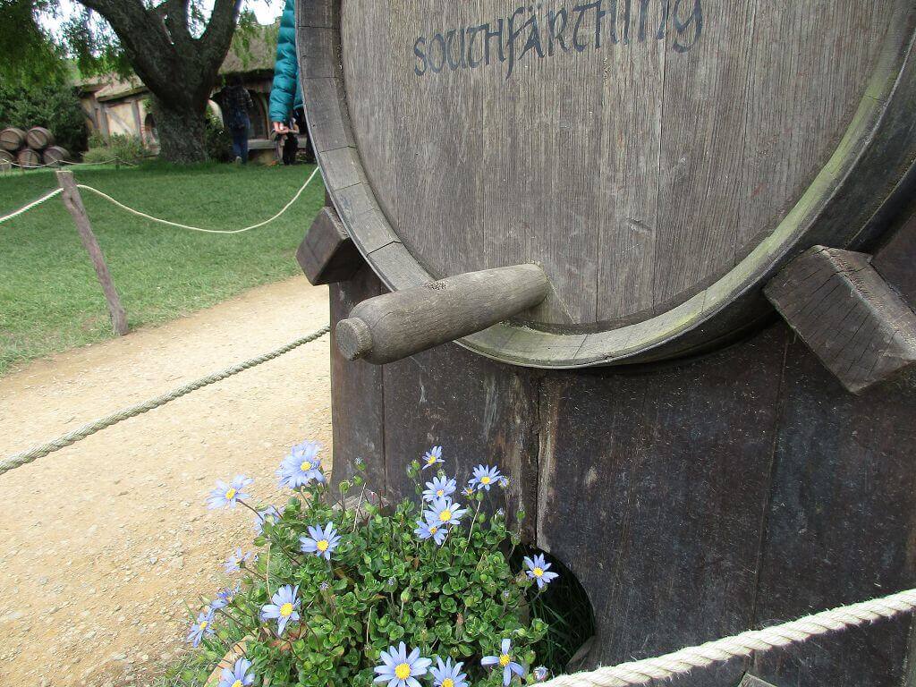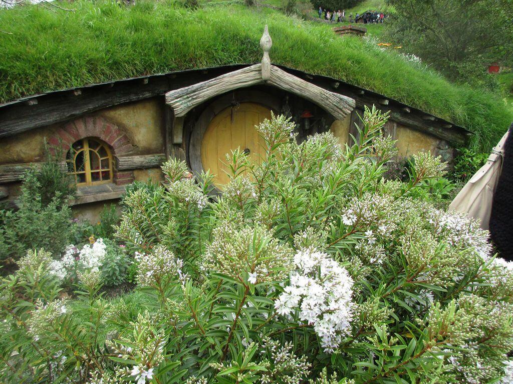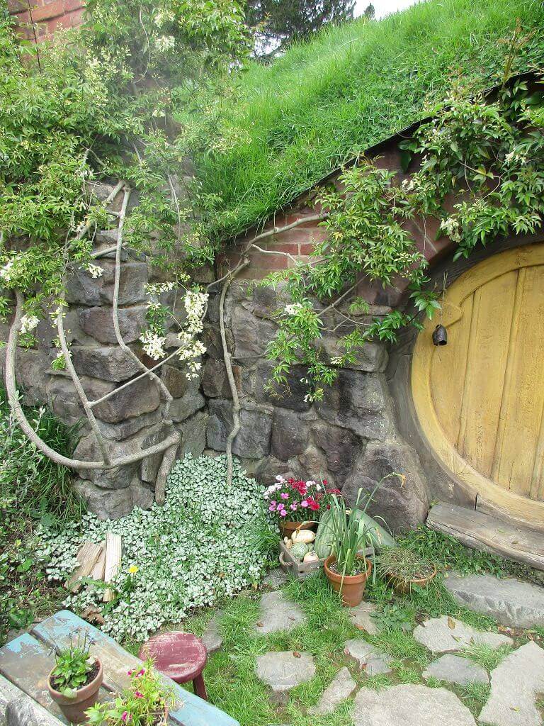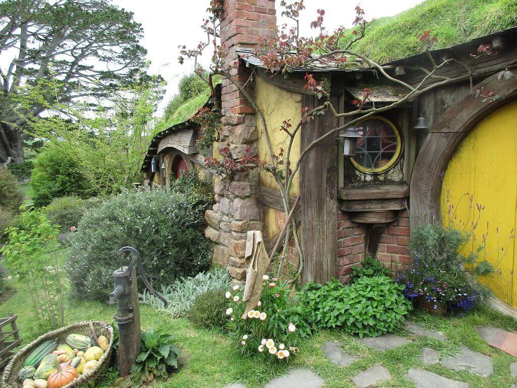 Am Eingang – dort wo auch der Film im Auenland beginnt – führt der Weg am Gemüsegarten vorbei. Und hier wächst es. Die Kartoffen sind hier gewachsen – sagt unser Guide. Und auch, dass am Ende dieses Tals der Hobbit wohnt, der dem Alkohol meist zuviel zuspricht. Gemütliche, propere Hummeln besorgen die Bestäubung der Blüten. Und in den Bäumen hängen Kalebassen mit Vogelfutter. Es gibt nicht nur öffentliches Grün, jedes deer Häuschen, die in den Berg hinein reichen – sind mit einen hüsch gepflegten Garten versehen. Jeder etwas anders – so wie die Profession ihrer Bewohner, jeder geht einem anderen Handwerk nach. Bäcker, Imker, Müller, Töpfer, Fischer – und Gärtner. Und ganz oben, mit der besten Aussicht, dort wohnt Bilbo Beutlin (hier natürlich Baggins) und Frodo. Draußen hängt die Wäsche. Und auf dem Dach steht ein Baum. Der im übrigen unecht ist. Das fällt mir schon von weitem auf. Ein bisschen Eiche ist echt, aber die Blätter sind alle handbemalt.