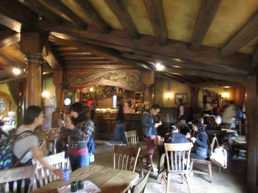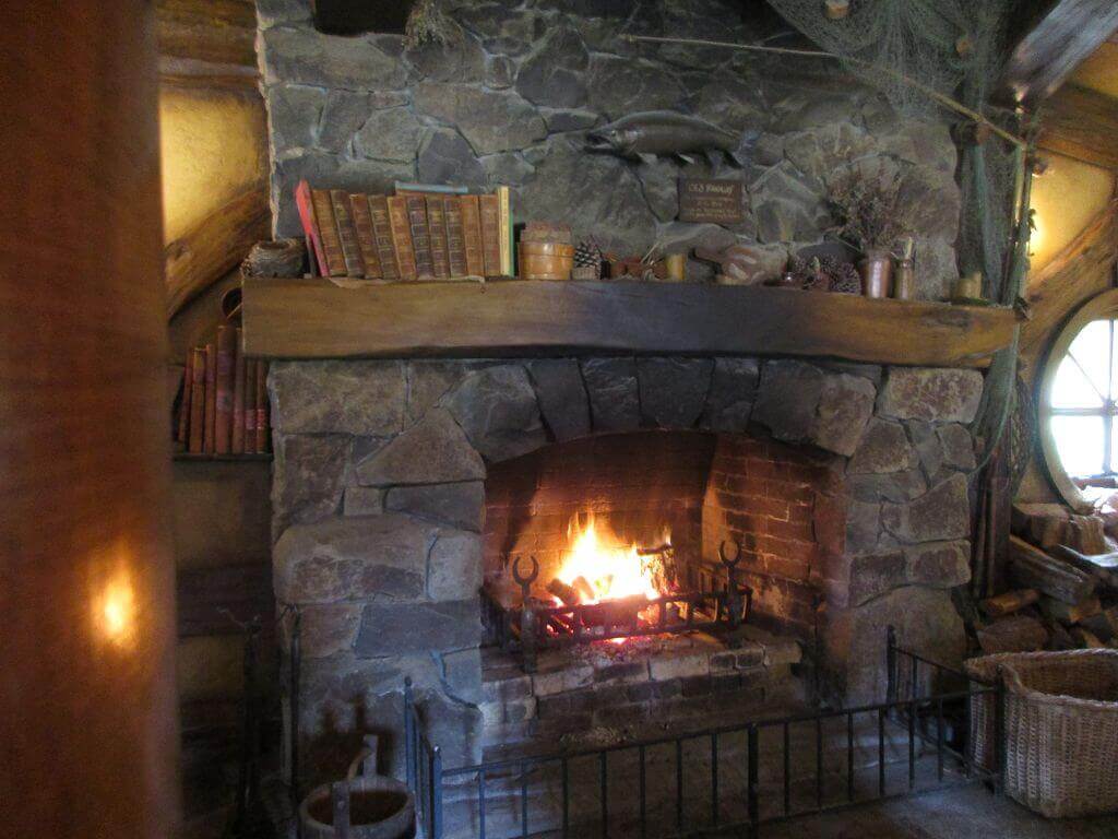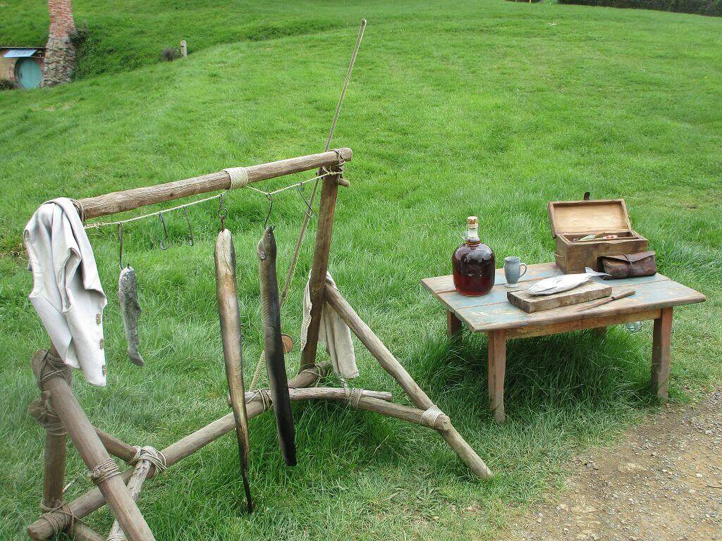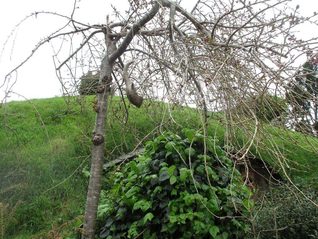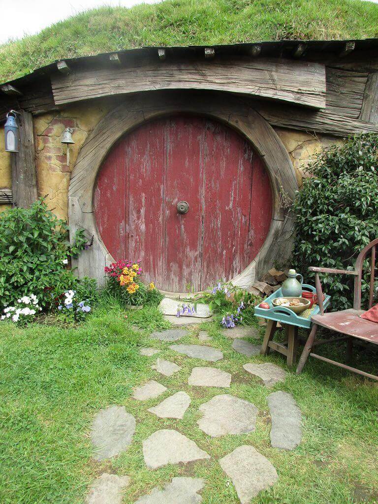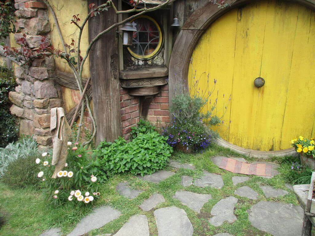Am Eingang – dort wo auch der Film im Auenland beginnt – führt der Weg am Gemüsegarten vorbei. Und hier wächst es. Die Kartoffen sind hier gewachsen – sagt unser Guide. Und auch, dass am Ende dieses Tals der Hobbit wohnt, der dem Alkohol meist zuviel zuspricht. Gemütliche, propere Hummeln besorgen die Bestäubung der Blüten. Und in den Bäumen hängen Kalebassen mit Vogelfutter. Es gibt nicht nur öffentliches Grün, jedes deer Häuschen, die in den Berg hinein reichen – sind mit einen hüsch gepflegten Garten versehen. Jeder etwas anders – so wie die Profession ihrer Bewohner, jeder geht einem anderen Handwerk nach. Bäcker, Imker, Müller, Töpfer, Fischer – und Gärtner. Und ganz oben, mit der besten Aussicht, dort wohnt Bilbo Beutlin (hier natürlich Baggins) und Frodo. Draußen hängt die Wäsche. Und auf dem Dach steht ein Baum. Der im übrigen unecht ist. Das fällt mir schon von weitem auf. Ein bisschen Eiche ist echt, aber die Blätter sind alle handbemalt.