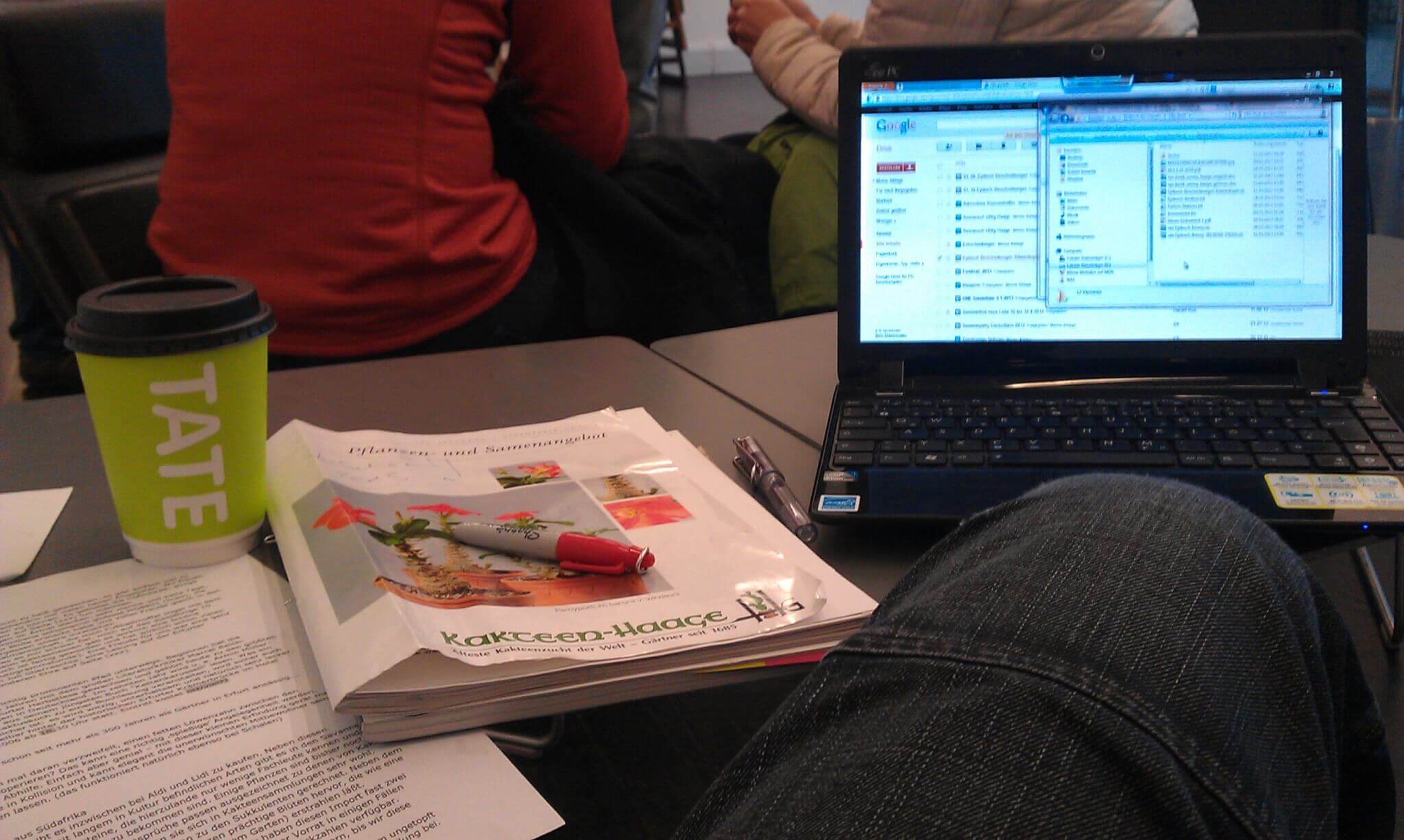 Anfangs sitze ich im Café, 1. OG. Ich packe meinen Schreibblock aus. Es zieht. Die Tasse ist schön, der Kaffee aber kalt. Die Waitress guckt unentspannt.