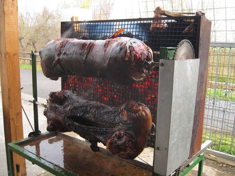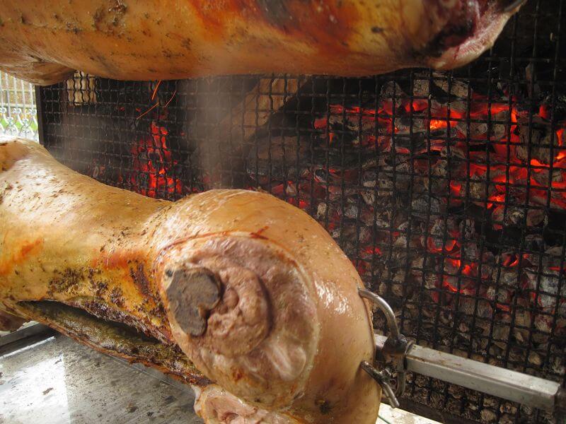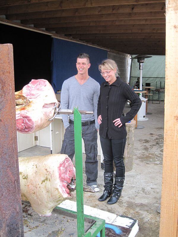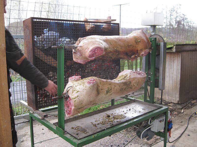 - Doppelgrill ist mit zwei Schweinen bestückt und betriebsbereit