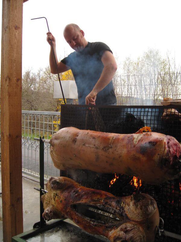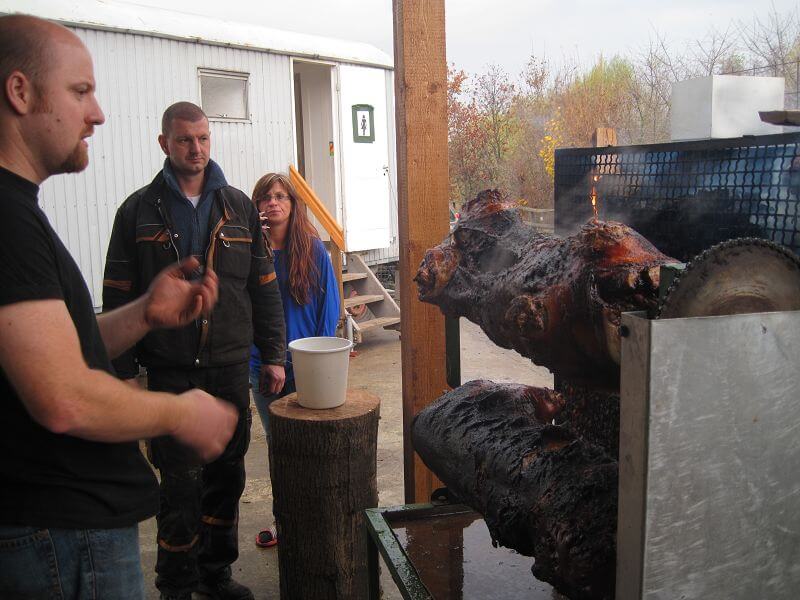 Freitag Abend bin ich mit Ralf gen Hessen gestartet um Samstag früh rechtzeitig den Grill anzufeuern. Die Bedingungen hier sind ideal. Der doppelläufige Grill von Jörg steht schon unter einem Dach bereit, daneben einige Klafter Ahorn und Buche sowie 40 Kilo Holzkohle. Eine Stunde später als geplant glüht der Grill, Ralph und Ralf machen sich daran die Schweine auf dem Spieß zu montieren. Zu dritt stehen wir uns schön im Weg, darum mache ich mich an den Kaktus-Salat, schneide Knoblauch und meinen Daumen. Als ich fertig bin drehen sich beide Schweine schon fröhlich und das erste ist schon richtig kross. Höchste Zeit für Löscharbeiten. Dazu habe ich eine Mischung aus Wasser, Apfelessig und Black Magic Finisher vorbereitet. Eine Sprayflasche ist der ideale Applikator und schützt vor verbrannten Fingern. Beim ersten Testlauf mussten die Beine komplett abgeschnitten werden, die Köpfe fehlten von Beginn an, sonst wäre der Spieß zu kurz gewesen. Die Keulen eigneten sich hervorragend zum probieren und abfüttern der Kinder und ersten Hungrigen. Die Keulen hingen provisorisch über dem Glutkasten, und waren dadurch wesentlich schneller gar. Erste Proben gingen schon nach 45 Minuten über den Tisch.