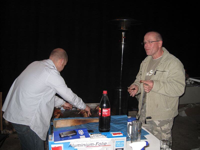 Planmäßig beginnen wir gegen 20.30 Uhr das erste Schwein zu zerlegen. Das Fleisch ist butterweich und oberlecker, die Schlage von Leuten reißt nicht mehr ab. Selbst am folgenden Morgen ernten wir noch Lob für die gelungenen Wutzen2 und Anfragen, ob wir das vielleicht auch mal auf einer anderen Veranstaltung wiederholen würden. Darüber haben wir noch nicht nachgedacht, aber im Moment gibt es in Sachen Kakteen so viele Dinge zu erledigen, dass wir uns keine neuen Projekte leisten können.